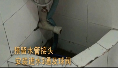 2.預(yù)留水管接頭,安裝進(jìn)水三通及球閥,進(jìn)水球閥纏生料帶16-18圈,將纏好的進(jìn)水球閥接入進(jìn)水三通,用扳手?jǐn)Q緊接頭,再將進(jìn)水三通纏生料帶11-13圈,將進(jìn)水三通和球閥裝在預(yù)留水管接頭處,并用扳手?jǐn)Q緊固定。