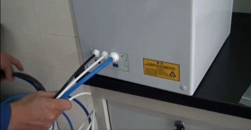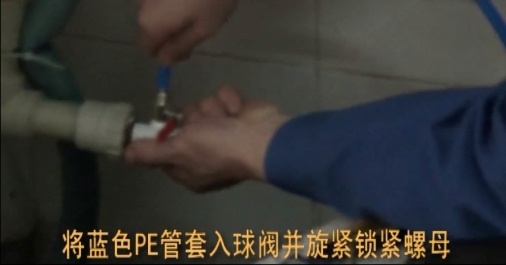 3.取下進(jìn)水球閥上的鎖緊螺母,套在藍(lán)色PE管上,將藍(lán)色PE管套入球閥并旋緊鎖緊螺母。