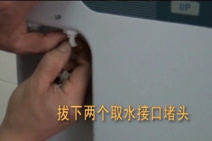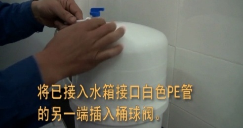 5.拿下水箱頂部藍(lán)色蓋帽,在螺紋處纏生料帶5圈,旋入桶球閥,用手直接擰緊,注意不要用力過大。將已經(jīng)接入水箱接口的白色PE管的另一端插入水箱頂部的桶球閥,然后嵌入卡環(huán) 。